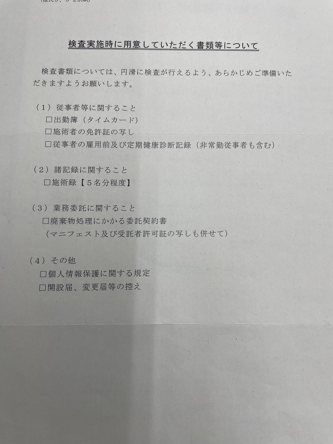 従業員の雇用前及び定期検診診断記録がいる。施術録に関しては全く中身は見ませんでした。用意して患者さんの名前が見えないように置いておくといいです。